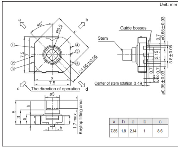 通过尺寸图可以了解到,这款五向开关是贴片的,尺寸上属于小尺寸,所以更加适合现在高度一体化的数码产品。