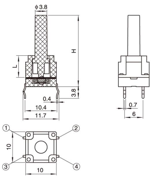 10*10矮盖红柄插件防水轻触开关尺寸图