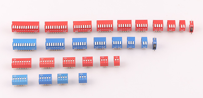 拨码开关很多款型号,按照脚位来区分有直插式( DIP) 和贴片式( SMD)之分,按照拨动的方式来分有平拨跟侧拨之分,按照脚间距有2.54mm 和 1.27mm 脚间距之分,按照颜色有黑色,红色,蓝色的区别。根据状态来说还有两态跟三态之分。根据位数来说正常是都是 1-10 位、 12 位等 11 个位数。其实细分下来,还有很多种。
