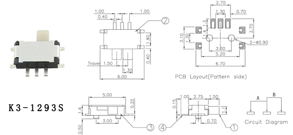 K3-1293S贴片7脚二档拨动开关电路接线图: