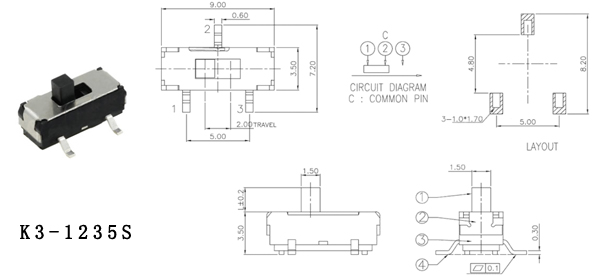 K3-1235D贴片10脚两档拨动开关电路接线图: