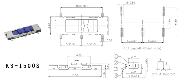 K3-1336S贴片四脚三档拨动开关电路接线图: