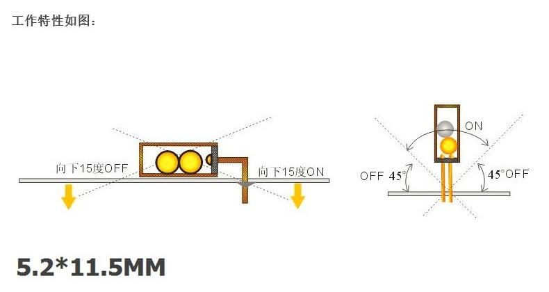 SW-520D是滚珠型倾斜感应单方向性触发开关,垂直悬挂的倾斜开关探头在受到外力作用且偏离垂直位置15度以上时,倾斜开关内部的金属球触点动作,常闭触点断开。当外力撤消后,倾斜开关回复到垂直状态,金属球触点复又闭合。它能设计各种产品倾斜、倾倒触发报警,倾倒断电传感器,倾斜传感器。滚珠开关目前已有许多不同类型的产品,包括角度感应开关、震动感应开关、离心力感应开关、光电式滚珠开关。