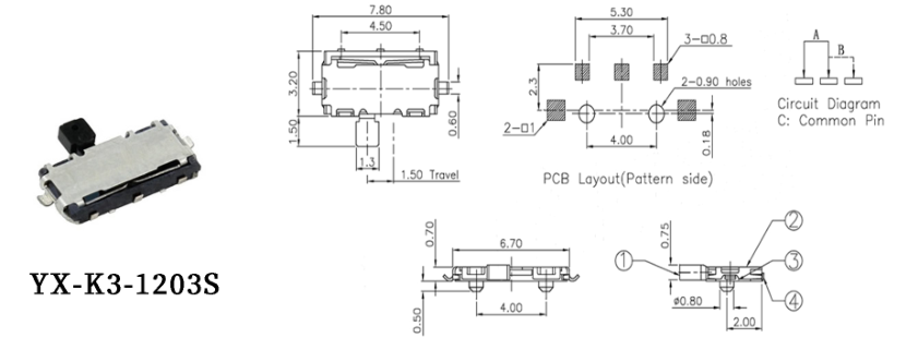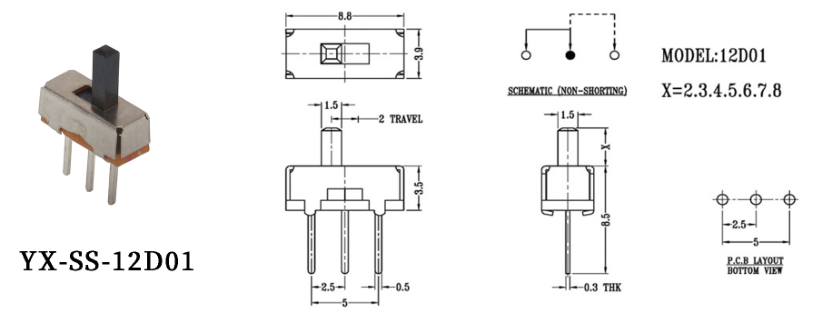 我们拨动开关通过里面的机械柄结构,经过推动,使其金属接触,形成电路的接通和断开,从而实现整个电路的状态却换目的,常规的款式有极双位、单极三位、双极双位以及双极三位,用在电压比较低的电路中。