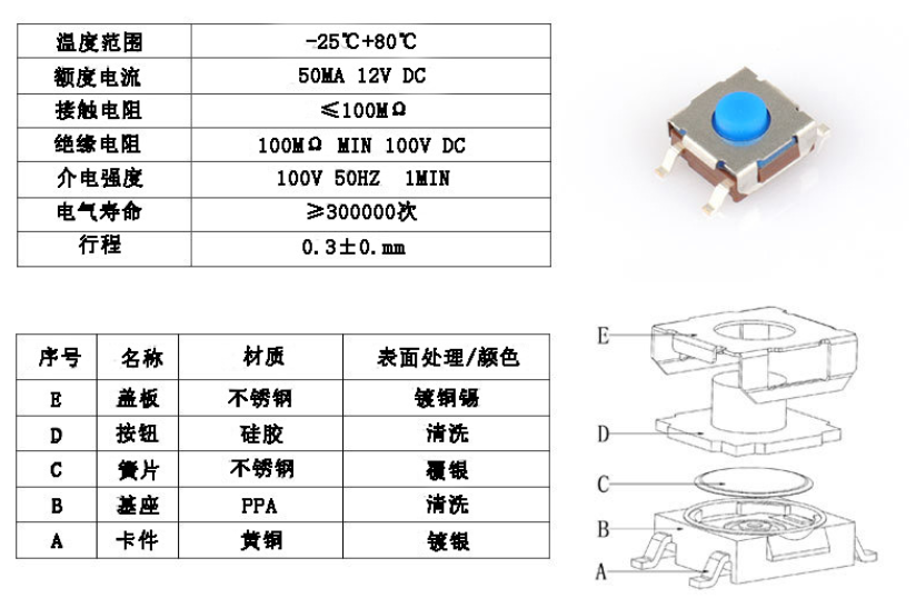3*6*3.85带支架轻触开关厂家批发价格:0.1~0.13元/个;额定电流:50ma DC12V;接触电阻:≤100mΩ;绝缘...